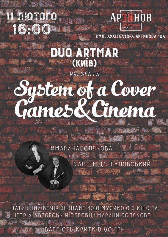 "Хочеш поринути у атмосферу улюбленого фільму чи згадати яскраві моменти культової гри? Можливо, посмішку на обличчя поверне ностальгія за улюбленим мультиком дитинства? Тоді Duo Artmar приготувало для тебе чудовий подарунок - концерт System of a Cover! Скрипка та фортепіано, звук та відео у затишній атмосфері Антикафе Артинов - мандруй разом із музикою в чарівні світи!"