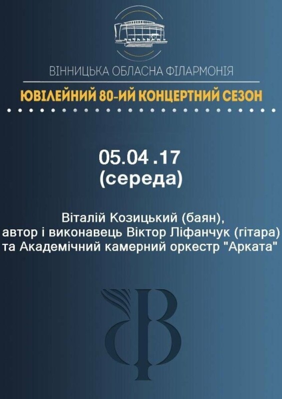 Герої фінального вечора абонементу Віталій Козицький (баян, м.Київ), автор і виконавець Віктор Ліфанчук (гітара, вокал, м.Вінниця) та Академічний камерний оркестр “Арката”.