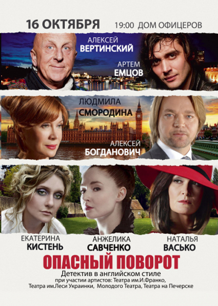 Новый «поворот» украинского независимого театра: презентация премьерного спектакля «Опасный поворот» по одной из самых знаменитых пьес ХХ века (английский драматург Д.Б.Пристли); проект осуществлен продюсерским центром «Домино-Арт» и ведущими актерами столичных театров.