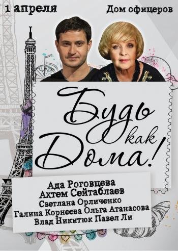 В спектакле сыграет любимица публики не только в Украине, но и во всем постсоветском пространстве – Ада Роговцева. В одной из главных ролей вы увидите яркую восходящую звезду столичного театра – Ахтема Сейталбаева. Талантливый актер мастерски справляется с ролями в спектаклях, которые проходят на сцене Национального театра им. Л. Украинки, успешно завоевав любовь зрителей. Также он дебютировал в качестве режиссера фильма «Че Гевара», который получил положительные отзывы как критиков, так и от зрителей. В спектакле сыграют Влад Никитюк и Ольга Атанасовп вместе с Галиной Корнеевой, Светланой Орличенко. Вы сможете насладиться игрой Екатерины Гуляковой и Павла Ли. Будь как дома спектакль - это удивительная история о человеческих взаимоотношениях, о недопонимании, о контрастных характерах, которые способны найти общий язык.