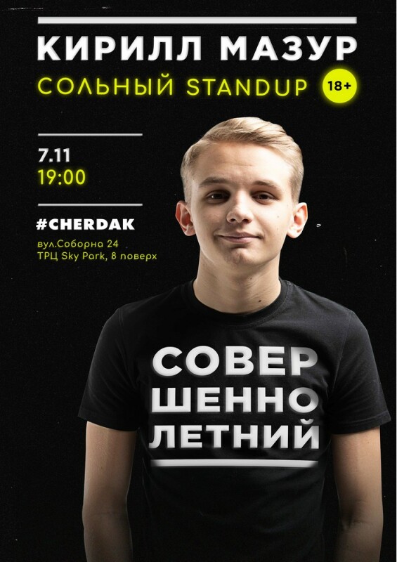 Сольный концерт Кирилла Мазура - это полуторачасовая программа, где собраны лучшие шутки и наблюдения комика! Выступление Кирилла для зрителя это как ностальгия по тем моментам в детстве, на которые он смотрит через призму юмора. В своих монологах шутит о взаимоотношениях мужчин и женщин, жизни с родителями и сложностях подростка в наше время. За 3 года занятия стендапом он уже стал одним из лучших комиков в Украине, трижды победителем "Рассмеши Комика" и резидентом проекта "Гуд Найт Клаб" на 1 1. Кирилл был хэдлйнером на различных муждународных стендап фестивалях и активно выступал на одной сцене с резидентами проекта "Stand Up" на ТНТ. Ждём вас, будет смешно!