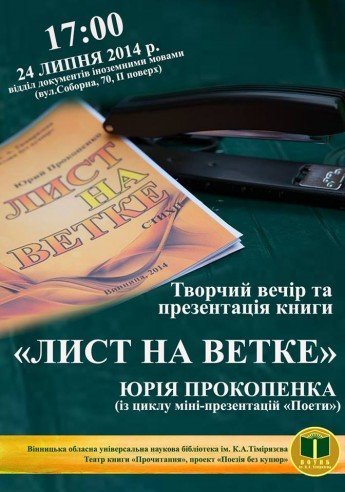 24 липня 2014 року о 17 годині в відділі документів іноземними мовами Вінницької обласної універсальної наукової бібліотеки ім. К.А. Тімірязєва (вул. Соборна, 70, філія, ІІ поверх) відбудеться творчий вечір та презентація книги «Лист на ветке» Юрія Прокопенка.