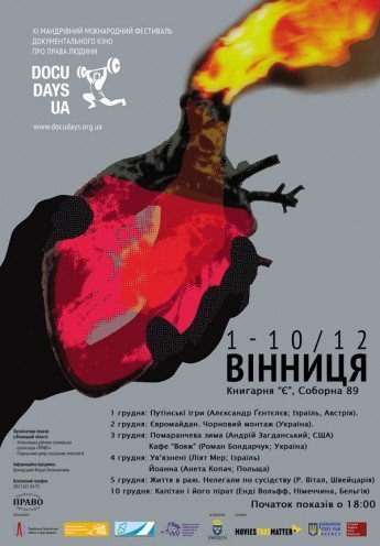 Цьогорічний XI Мандрівний фестиваль документального кіно про права людини Docudays UA у Вінниці, організаторами якого традиційно є Вінницька обласна громадська організація «Подільський центр соціальних технологій» та Хмільницька районна громадська організація «ПРАВО», протягом тижня запропонує глядачам актуальні фільми виробництва України, США, Ізраїлю, Польщі, Швейцарії та інших країн. Крім того, мешканці і гості міста матимуть змогу взяти участь у обговоренні стрічок.