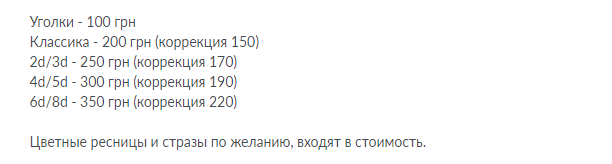 Аналогичные услуги предлагает Марина. Классическое наращивание ресниц в её исполнении стоит 200 гривен, 2Д – 200-250 гривен, 3Д – 250-300 гривен и 4Д от 350 до 400 гривен.