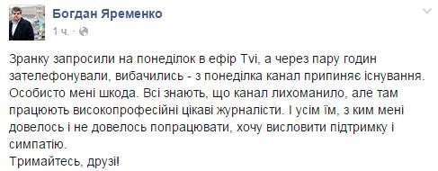 Про закриття телеканалу повідомив також дипломат, колишній генконсул України в Стамбулі Богдан Яременко.