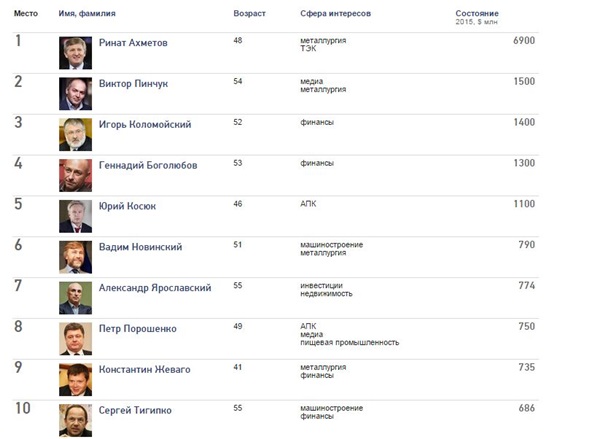 Самым богатым украинцем остается Ринат Ахметов. Состояние олигарха оценивается в 6,9 миллиарда долларов. На втором месте - медиамагнат Виктор Пинчук (1,5 миллиарда долларов), на третьем - основатель финансовой группы Приват Игорь Коломойский (1,4 миллиарда долларов).