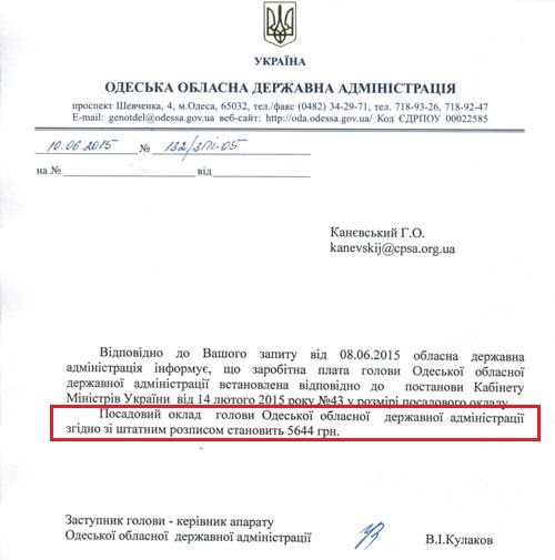 Должностной оклад нового главы Одесской облгосадминистрации Михаила Саакашвили составляет 5644 гривны в месяц. Об этом говорится в ответе руководителя аппарата ОГА Владимира Кулакова на запрос политолога Глеба Каневского, который обнародовал документ в своем блоге на Украинской правде.